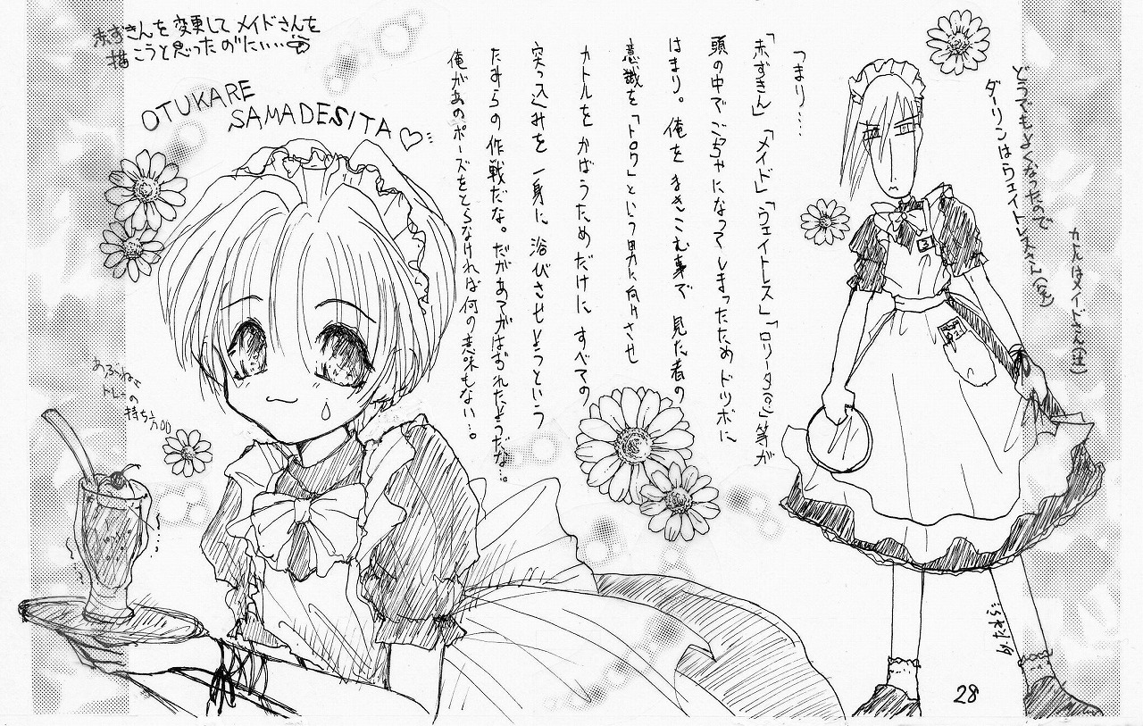 描いているうちにメイドさんのコスだか、ウエイトレスさんだか、リトル○ースのこすだか、わけがわからなくなったものです。